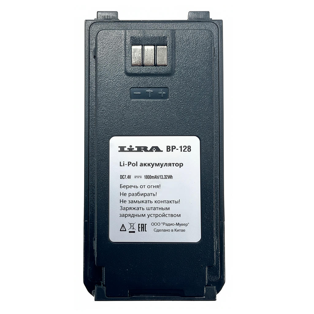 Миниатюрный литий-полимерный аккумулятор Lira BP-128 ёмкостью 1800 мАч спроектирован для субкомпактной радиостанции P-128L NEW, предлагая оптимальный баланс между весом и продолжительностью автономной работы.