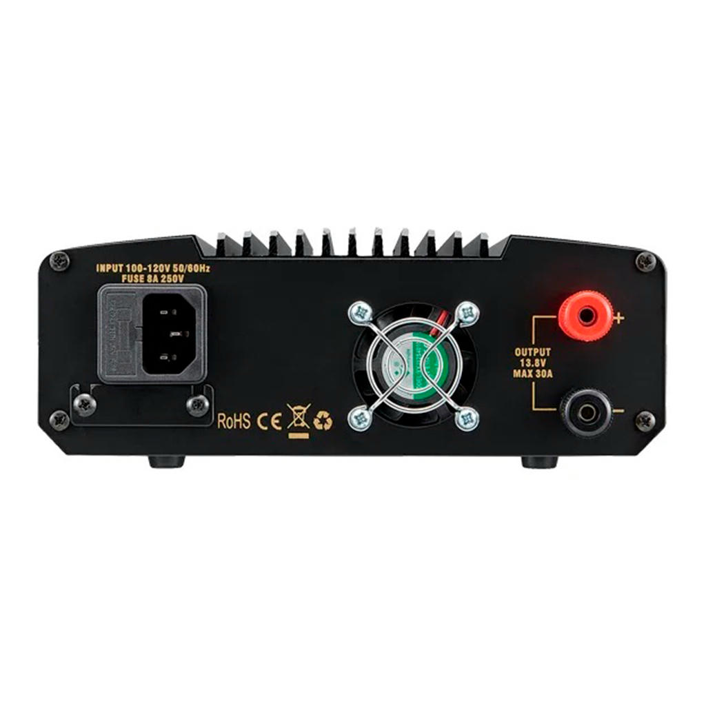 Источник питания для стационарных базовых радиостанций, усилителей мощности и вспомогательного оборудования, работающего от постоянного напряжения 12 В. Подключается к сети 220 В / 50 Гц, обеспечивает регулируемое напряжение на выходе от 9 до 15 В при непрерывном токе нагрузки 25 А и кратковременной нагрузке до 30 А в режиме приём/передача.