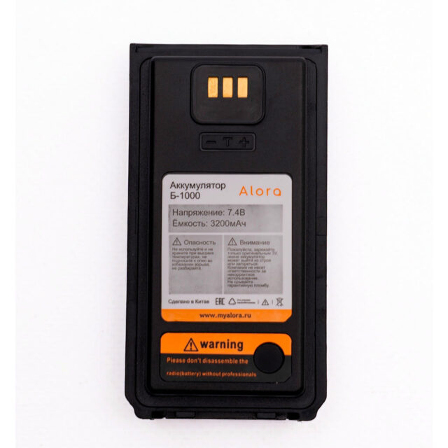 Литий-ионный аккумулятор повышенной ёмкости 3200 мА·ч — штатный источник питания для многоканальной рации Алора А-1000. Встроенный разъём USB Type-C обеспечивает зарядку напрямую от кабеля без обязательного использования зарядной базы. Страна производства — Китай.