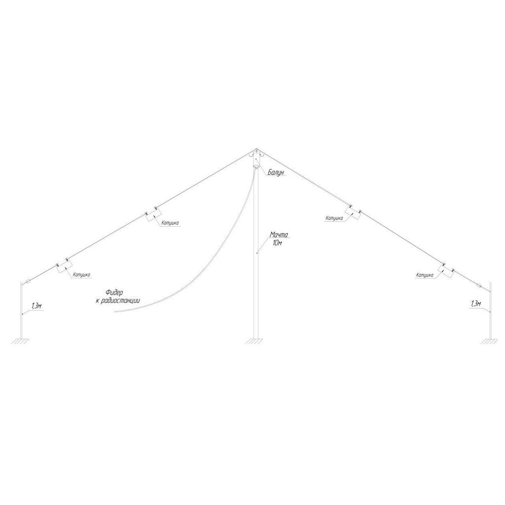 Конструкция выполнена из стального латунированного тросика в ПВХ изоляции общей длиной 41 м. Антенна имеет два уровня трапов без конденсаторов, разъём SO-239 и встроенную грозозащиту. Балун с токовым дросселем обеспечивает качественное симметрирование.