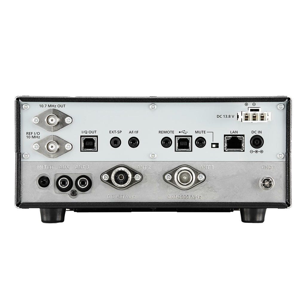 Стабильность частоты обеспечена высокоточным OCXO с уходом ±0.5 ppm. Цифровые IF-фильтры с регулируемой полосой (50 Гц – 3.6 кГц) и встроенный шумоподавитель (NR) эффективно очищают сигнал. Функция IP+ улучшает интермодуляционные характеристики. Приёмник имеет выход I/Q для подключения к ПК и анализа спектра сторонним ПО (например, HDSDR).