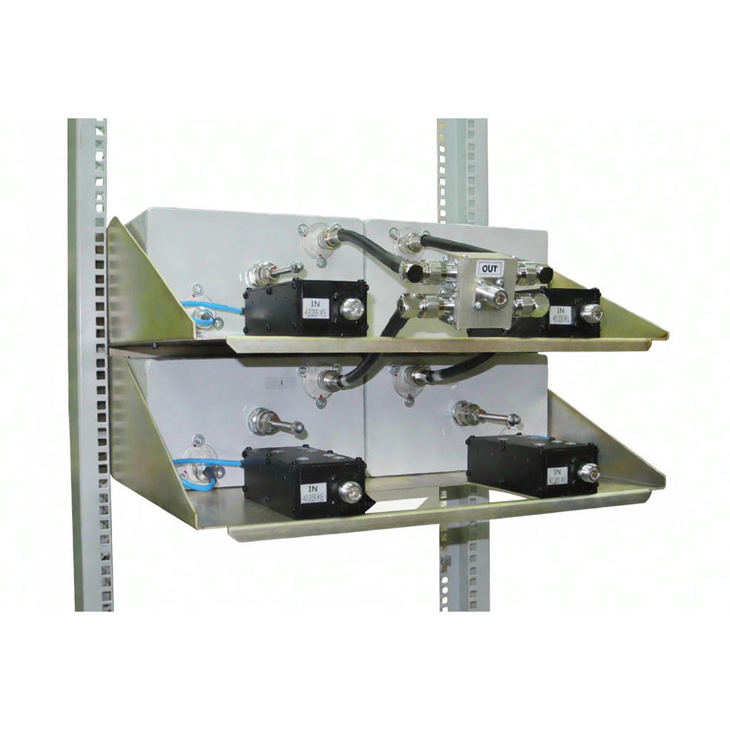 Монтаж в 19″ стойку упрощает компоновку оборудования ретранслятора и базовой станции. При проектировании системы следует учитывать вносимые потери комбайнера 3.4 дБ и выбирать мощность передатчиков с запасом для обеспечения требуемого радиуса покрытия с учётом всех потерь антенно-фидерного тракта.