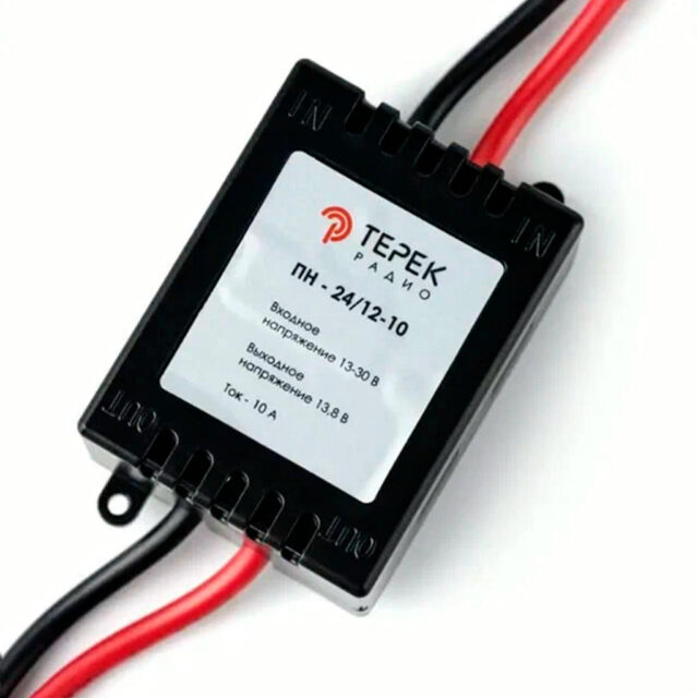 Специализированный DC/DC-преобразователь Терек ПН-24/12-10, разработанный для подвижных объектов — грузовых автомобилей, автобусов, спецтехники и транспортных средств с бортовой сетью 24 В. Преобразует входное постоянное напряжение диапазона 13–30 В в стабилизированные 13,8 В для питания радиостанций, навигационного и охранного оборудования с номинальным питанием 12 В.