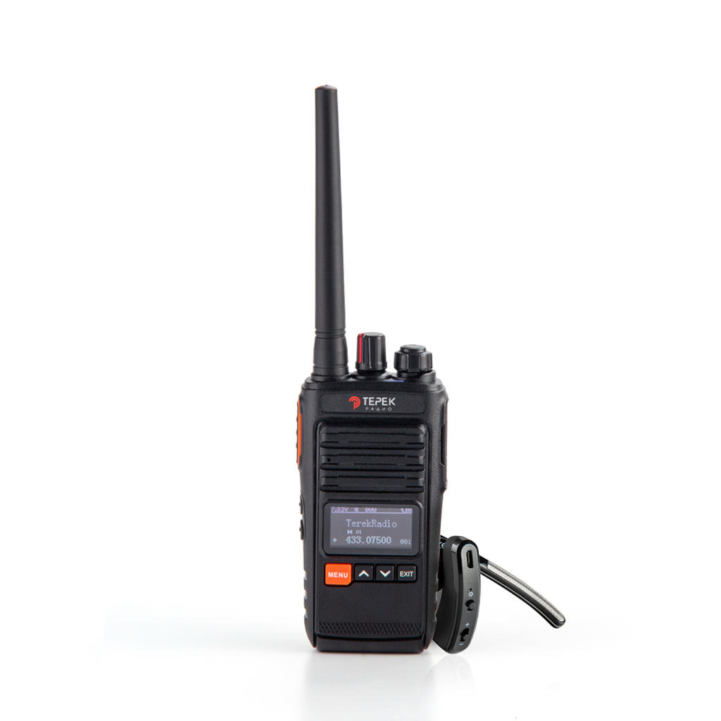 Радиостанция Терек РК-212 Military BT+ версия популярной модели РК-212 Military, дополненная встроенным модулем Bluetooth 4.2 и беспроводной гарнитурой в комплекте. Работает в диапазонах VHF (136–174 МГц) или UHF (400–480 МГц) на выбор. Передатчик обеспечивает выходную мощность 5.2 Вт с возможностью переключения на пониженный уровень (от 0.01 до 2.5 Вт), что позволяет адаптировать дальность связи (до 13 км в открытой местности) под конкретные условия и экономить заряд аккумулятора. Приёмник с чувствительностью 0.16 мкВ (12 дБ SINAD) и избирательностью по соседнему каналу 60 дБ (12.5 кГц) и 70 дБ (20/25 кГц) обеспечивает уверенный приём слабых сигналов и высокую помехоустойчивость. Радиостанция поддерживает 502 канала памяти (два банка по 250 каналов), а также кодирование CTCSS для фильтрации посторонних переговоров. Встроенный скремблер и компандер защищают переговоры от прослушивания и улучшают разборчивость речи. Цифровой сервис Digital Service позволяет организовывать закрытые группы с идентификацией абонентов. Ключевое преимущество модели — наличие Bluetooth-гарнитуры в комплекте, которая обеспечивает беспроводную связь с радиостанцией на расстоянии до 10 метров, что особенно удобно для водителей, охранников и сотрудников, которым необходима свобода движений при ведении переговоров.
