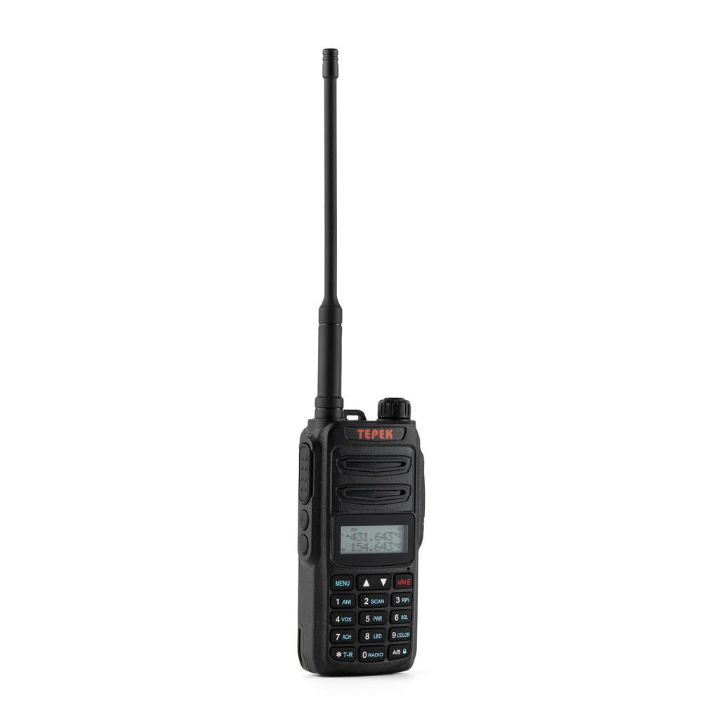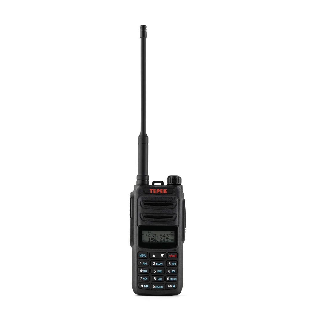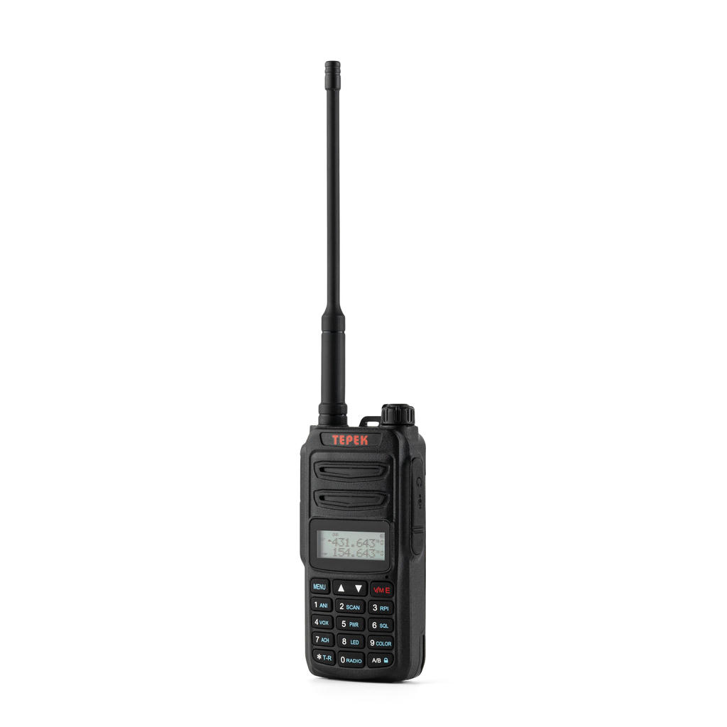 Двухдиапазонная портативная радиостанция Терек РК-222 работает одновременно в диапазонах VHF (136–174 МГц) и UHF (400–480 МГц), что позволяет оперативно взаимодействовать с абонентами, использующими разные частотные диапазоны, и вести связь в двух сетях без переключения канала. Передатчик обеспечивает выходную мощность 5.2 Вт с возможностью переключения на пониженный уровень (от 0.01 до 2.5 Вт), что даёт возможность адаптировать дальность связи (до 10 км в открытой местности) под конкретные условия и экономить заряд аккумулятора. Приёмник с чувствительностью 0.25 мкВ (12 дБ SINAD) и избирательностью по соседнему каналу 60 дБ (12.5 кГц) и 68 дБ (20/25 кГц) обеспечивает уверенный приём слабых сигналов и высокую помехоустойчивость. Радиостанция Терек РК-222 поддерживает 256 каналов памяти, а также кодирование CTCSS, DCS, DTMF и MSK для организации групповых и индивидуальных вызовов, фильтрации посторонних переговоров. Встроенный скремблер защищает переговоры от несанкционированного прослушивания, делая речь неразборчивой для сторонних раций без аналогичного скремблера. Благодаря двум независимым приёмникам на дисплее одновременно отображаются две частоты (верхняя и нижняя строки), и можно контролировать два канала без переключения.