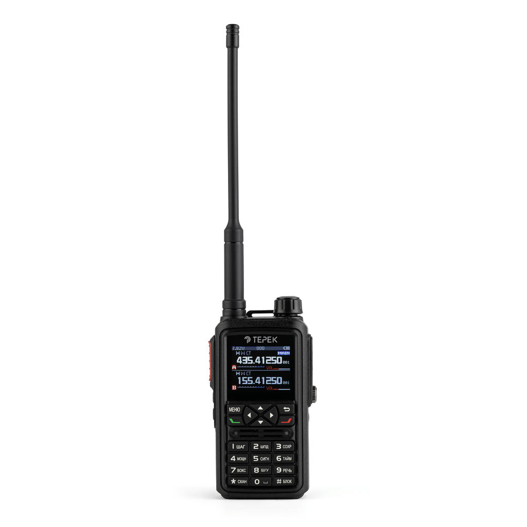Двухдиапазонная портативная радиостанция Терек РК-4312-2Д работает в диапазонах VHF (136–174 МГц) и UHF (400–480 МГц), а также принимает сигналы авиационного диапазона 118–135.975 МГц (только RX), что позволяет прослушивать переговоры наземных служб и воздушных судов. Мощность передатчика составляет 5 Вт с возможностью переключения на пониженный уровень (от 0.01 до 2.5 Вт) для экономии заряда аккумулятора при работе на коротких расстояниях. Дальность связи в открытой местности достигает 10 км. Радиостанция оснащена двумя независимыми приёмниками: на дисплее одновременно отображаются две частоты (основная и вспомогательная), что позволяет контролировать два канала без переключения. Для удобства предусмотрены две отдельные клавиши PTT — по одной на каждый диапазон, что исключает необходимость выбирать активный канал перед передачей. Поддерживается режим кросс-бенд ретранслятора (VHF ↔ UHF) с настройкой направления ретрансляции. Встроенный быстрый сканер частоты автоматически определяет несущую частоту и субтон (CTCSS/DCS) активного передатчика при поднесении рации на расстояние 10–20 см — эта функция незаменима при настройке и клонировании параметров с неизвестной радиостанции. Цифровой режим Digit (совместимый с моделями Терек РК-212 и Терек Спорт) позволяет объединять рации в закрытые группы с идентификацией абонентов: на дисплее отображается имя говорящего, а одновременная передача двух абонентов в одной группе блокируется, что исключает коллизии в эфире. Аппаратный скремблер и компандер обеспечивают защиту от прослушивания и улучшают разборчивость речи в шумной обстановке.