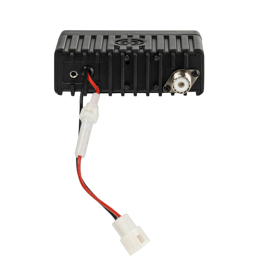 Радиостанция заключена в цельнолитой фрезерованный алюминиевый корпус, который не только защищает электронику от ударов и вибраций, но и служит эффективным радиатором для отвода тепла при длительной работе на максимальной мощности. Класс защиты IP54 обеспечивает устойчивость к пыли и брызгам, позволяя эксплуатировать устройство в запылённых помещениях и на улице при неблагоприятных погодных условиях. На передней панели установлен большой ЖК-дисплей с регулируемой яркостью оранжево-пурпурной подсветки, который остаётся читаемым как при ярком солнце, так и в полной темноте. Полнофункциональная клавиатура позволяет оперативно менять частоту, каналы, уровни мощности и другие параметры без подключения к компьютеру. Механический выключатель питания совмещён с регулятором громкости, что упрощает управление. На задней панели расположены антенный разъём UHF (SO-239 female), разъём для внешнего динамика (3.5 мм) и кабель питания с двумя предохранителями. Рабочий диапазон температур составляет от -20 до +60 °C, что делает станцию пригодной для использования в различных климатических зонах.