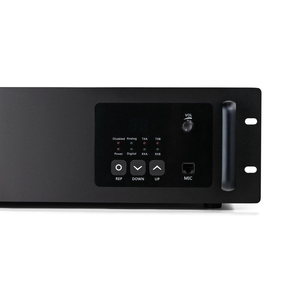 - Разъём для тангенты на передней панели даёт возможность диспетчеру или техническому персоналу выходить в эфир непосредственно с ретранслятора.