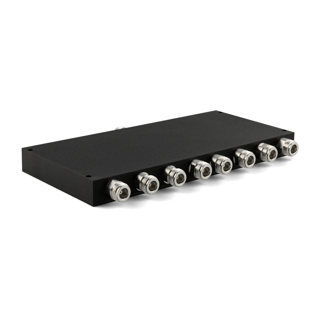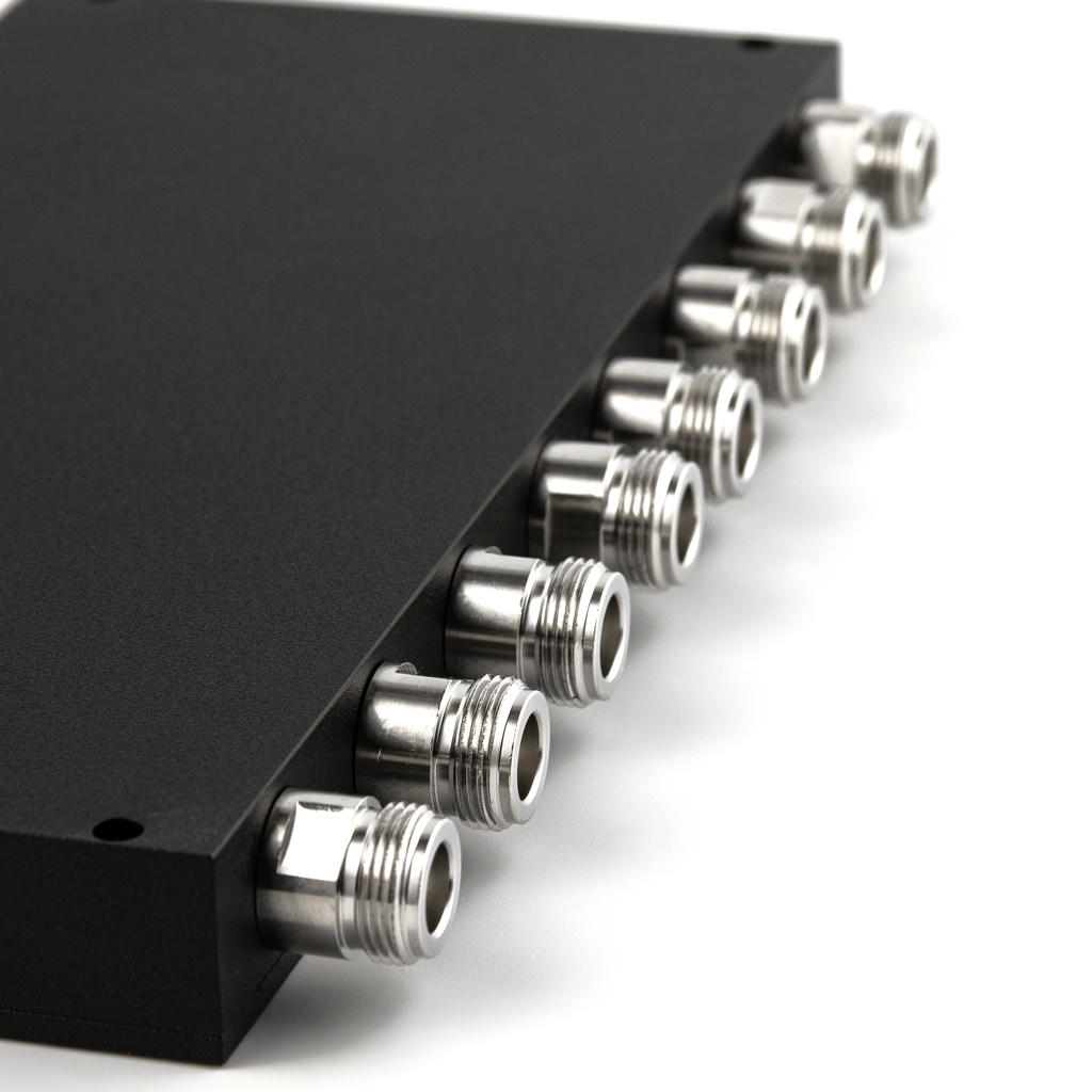 Сумматор мощности на восемь входов построен на каскадной структуре четвертьволновых трансформаторов с жёсткими коаксиальными линиями и воздушным диэлектриком. Устройство объединяет мощность восьми передатчиков в диапазоне 400-490 МГц и применяется в высокоёмких узлах профессиональной радиосвязи — многоканальных базовых станциях DMR, TETRA и объектовых ретрансляторных комплексах UHF.